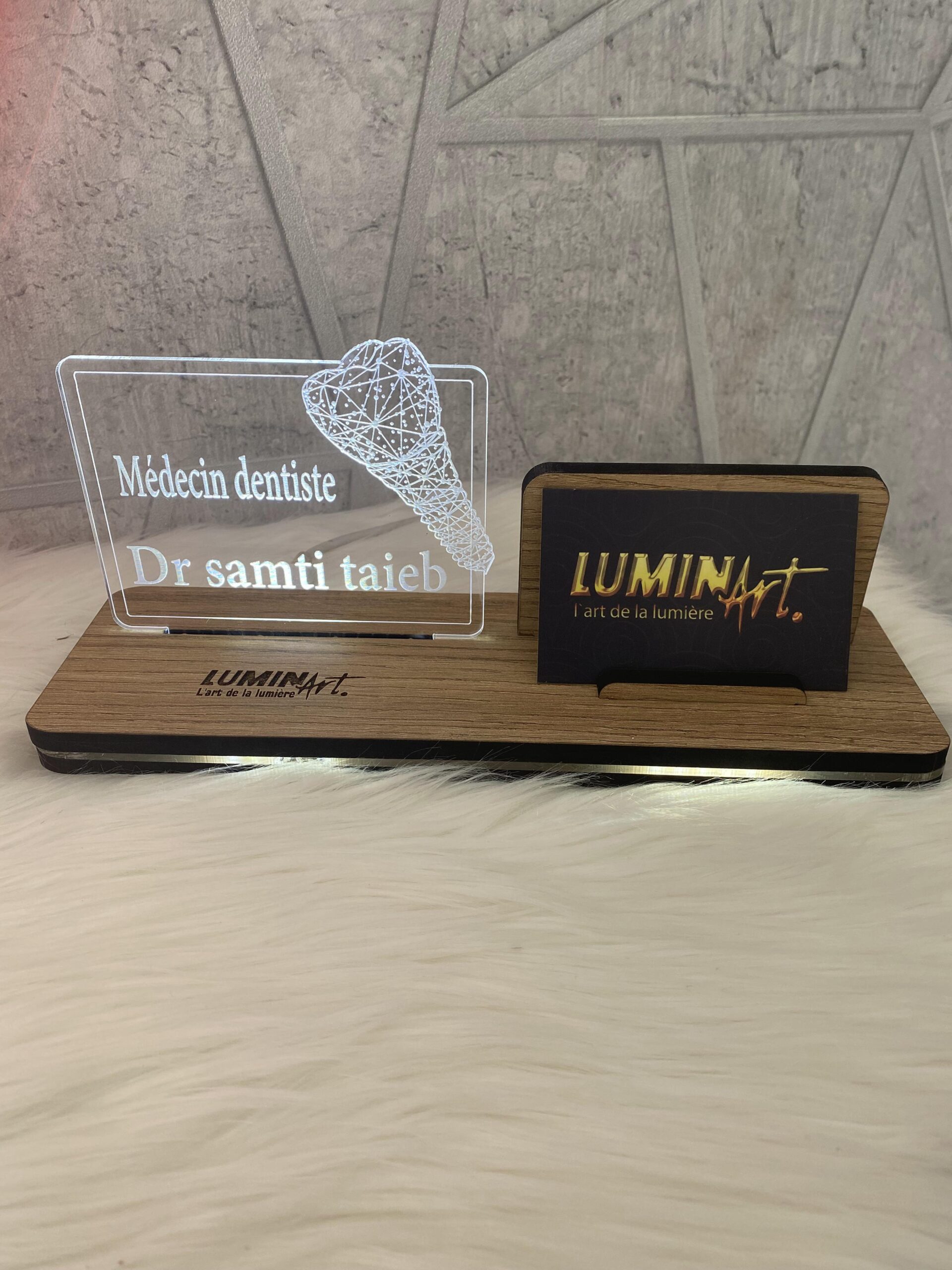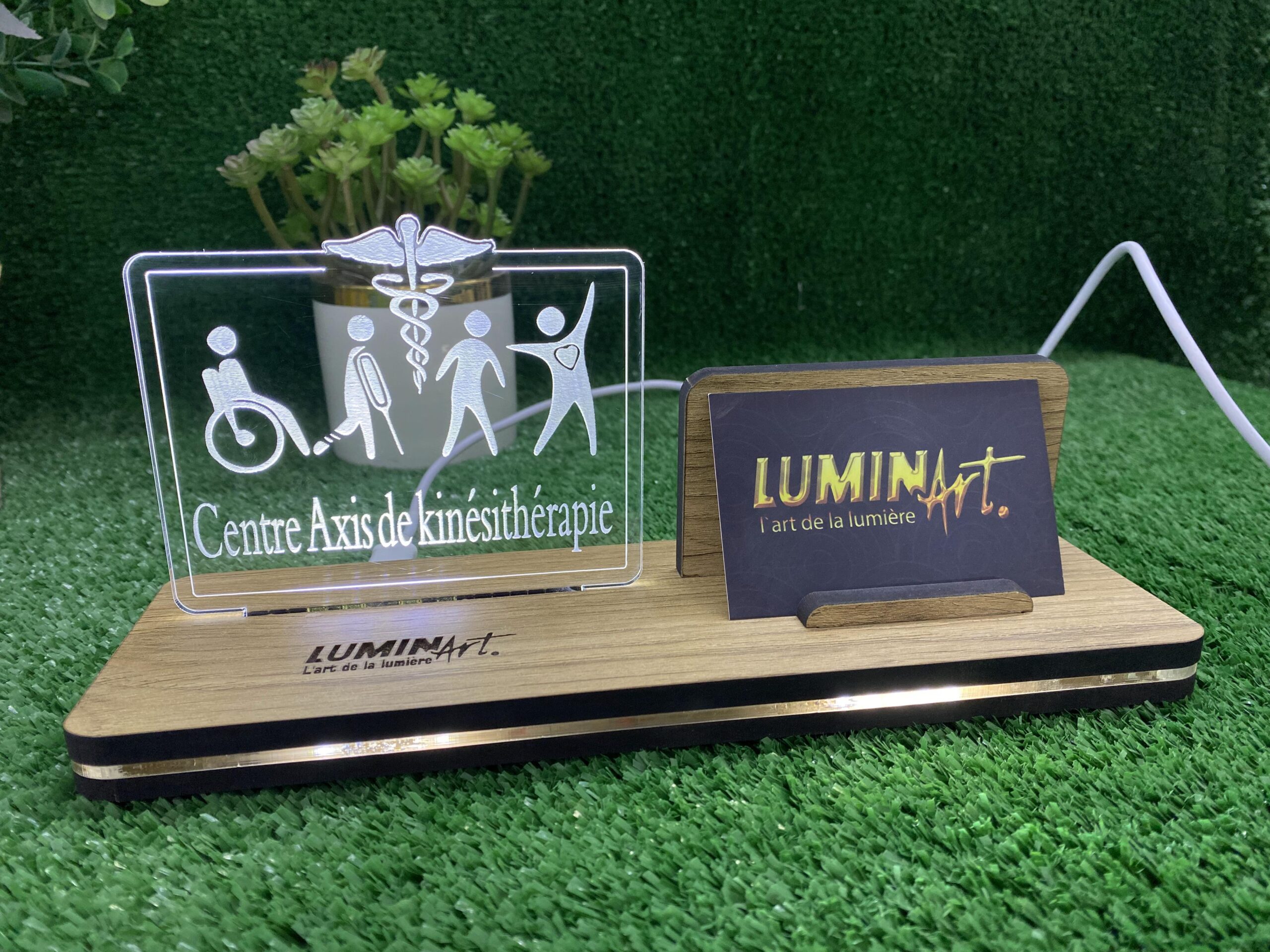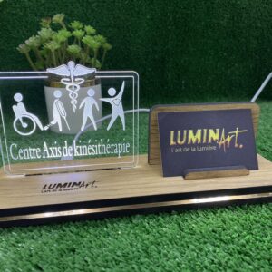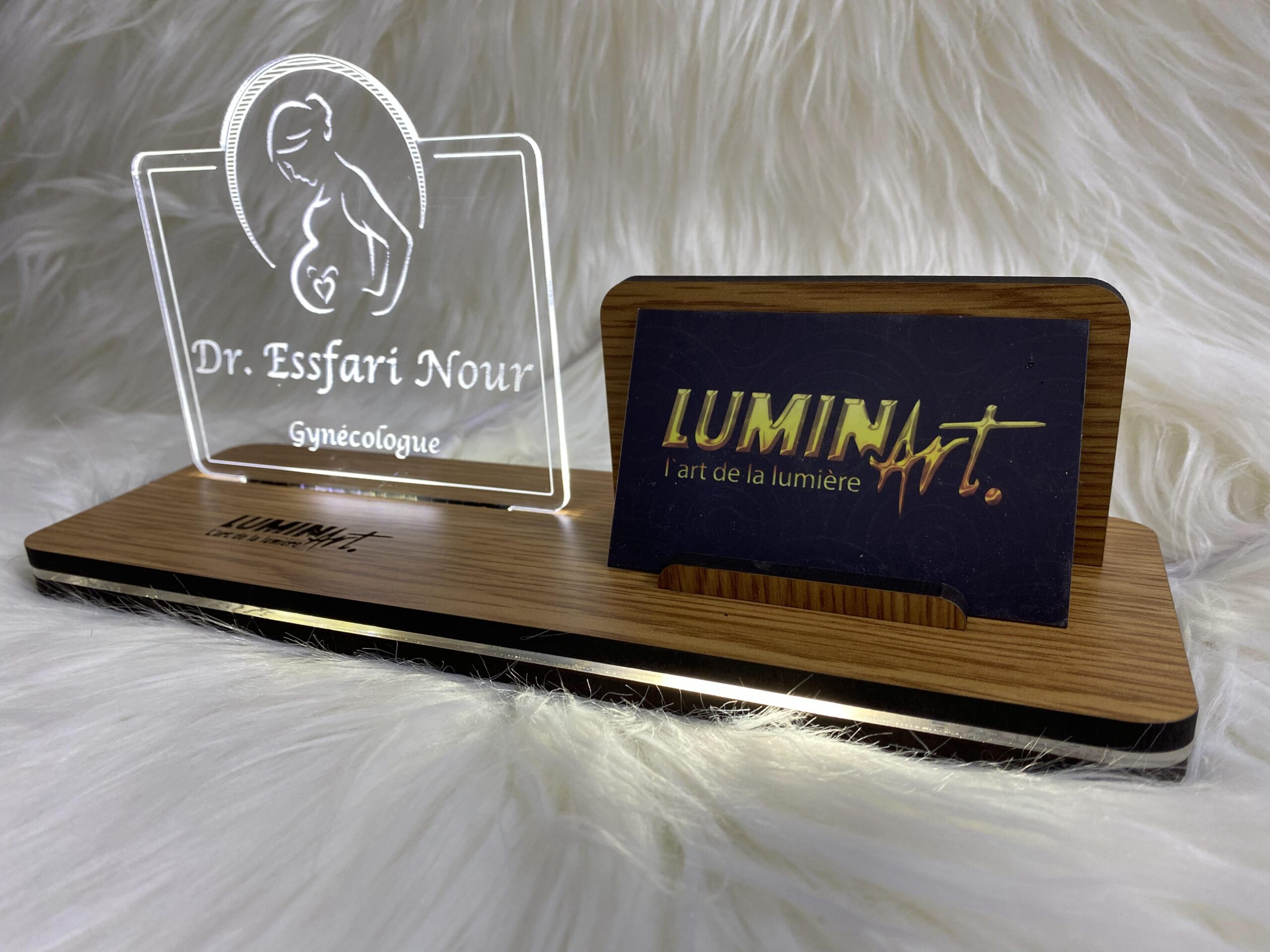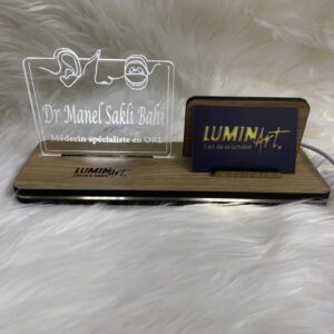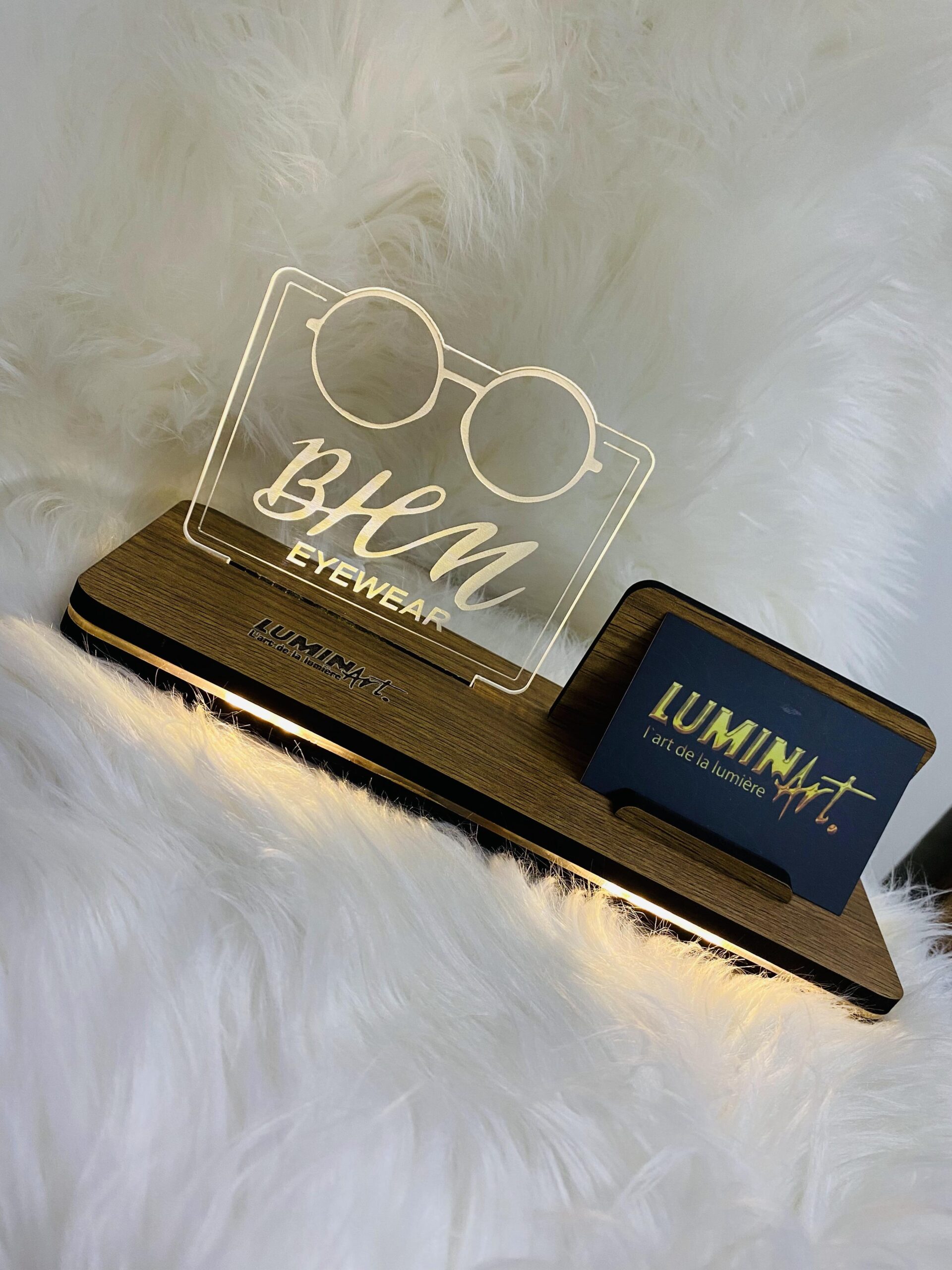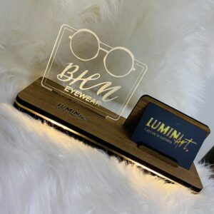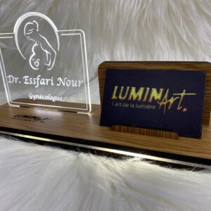 Mettez en valeur votre identité professionnelle avec ce support de carte de visite lumineux, alliant design moderne et personnalisation sur mesure. Conçu en bois et plexiglas LED, il illumine vos informations avec élégance, parfait pour un bureau, une réception ou un cabinet.