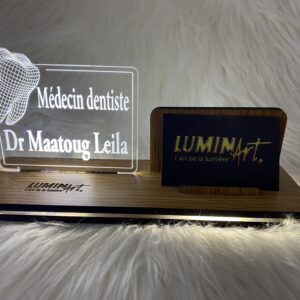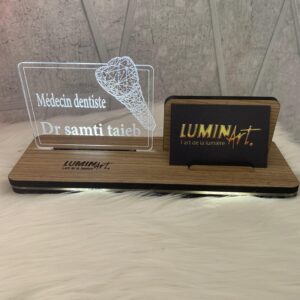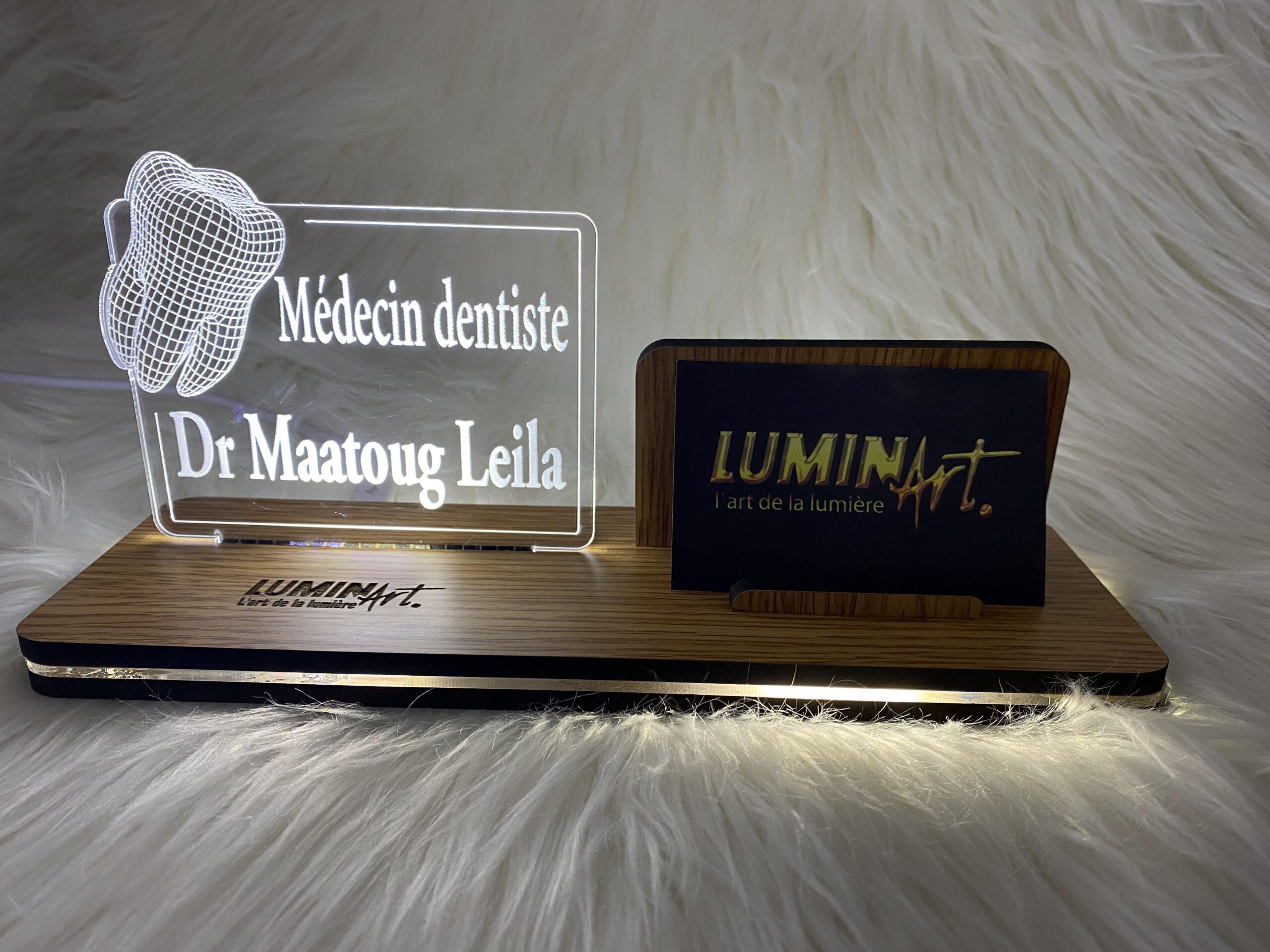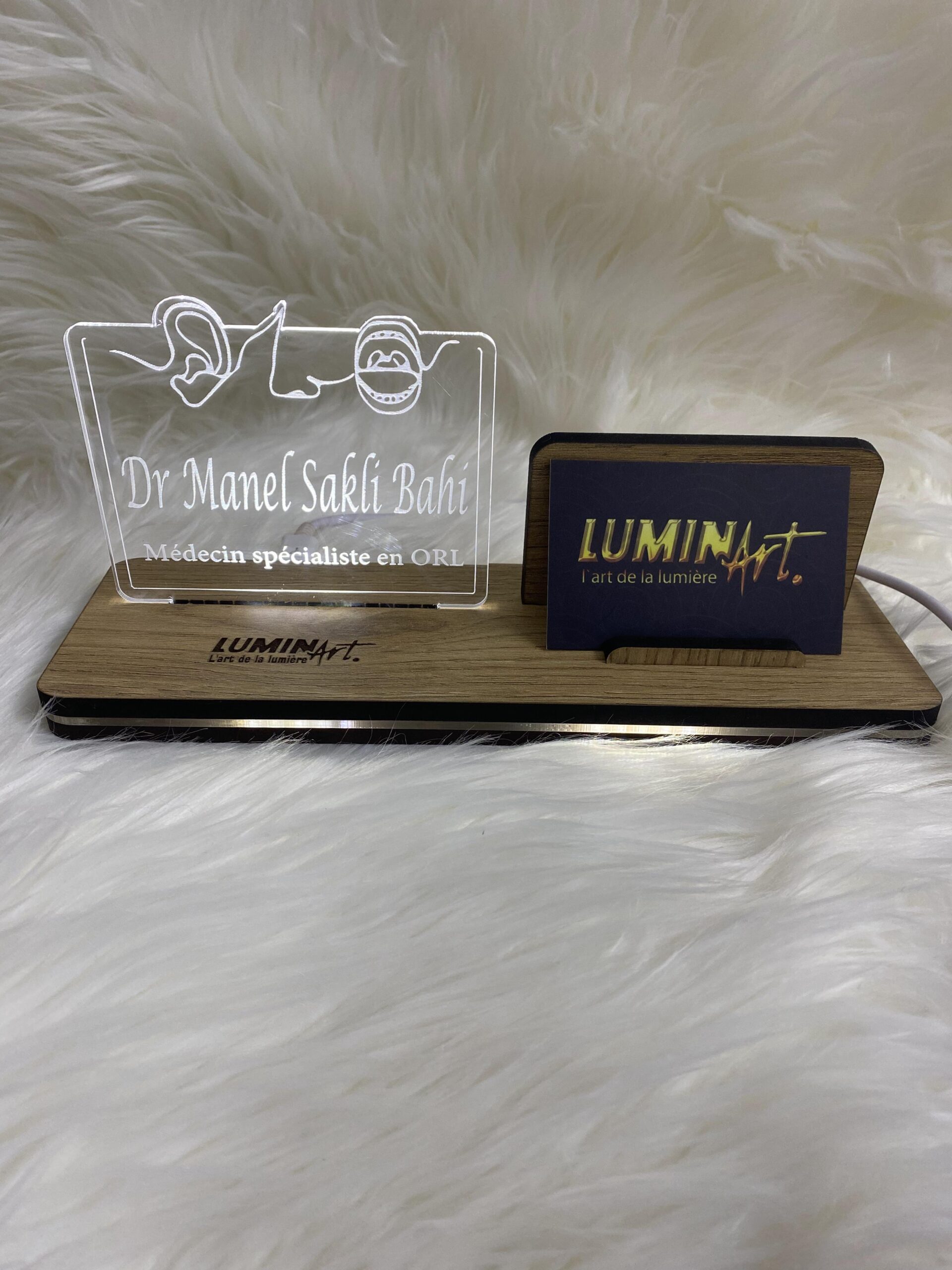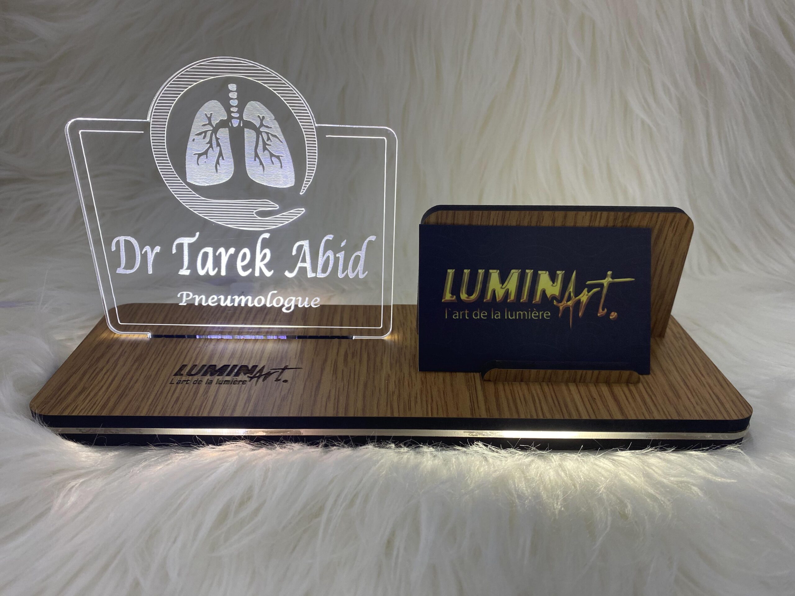 Mettez en valeur votre identité professionnelle avec ce support de carte de visite lumineux, alliant design moderne et personnalisation sur mesure. Conçu en bois et plexiglas LED, il illumine vos informations avec élégance, parfait pour un bureau, une réception ou un cabinet.